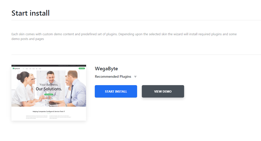 When the plugins are installed it is time to install demo content for your theme. TM Wizard will offer you to do just that.