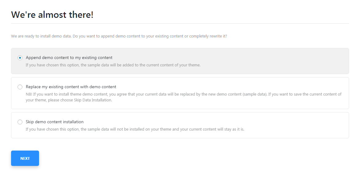- This option will append the demo content for your theme with your existing content.