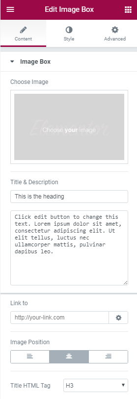 Image Box module lets you add image boxes that combine images, headlines and text. Mostly and alternatively this is used for the Icon Box Widget, for features sections. With this module you can change design of the image, the headline and the description.