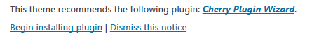 After theme activation you will get a notice which offers you to install Cherry Plugin Wizard. To continue plugins and demo contents installation with Cherry Plugin Wizard just hit Begin installing plugin link. You will be transfered to the page where you can select the needed plugins.